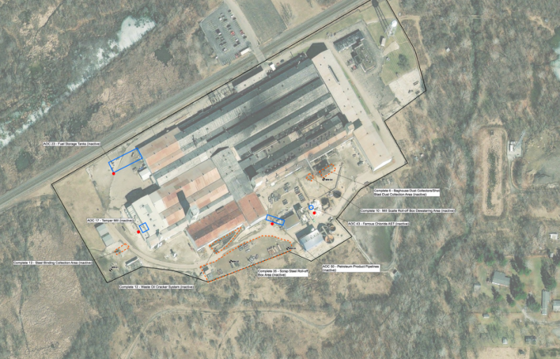 In related developments, further investigation at the Louisville facility is underway. A RCRA Facility Investigation Work Plan Addendum prepared by Groundwater & Environmental Services, Inc. on April 23, 2025, outlines additional soil and groundwater sampling at four specific areas of concern. The addendum identifies AOC 17 (Temper Mill), AOC 23 (Fuel Storage Tanks), AOC 43 (Ferrous Chloride Aboveground Storage Tank), and AOC 50 (Petroleum Product Pipelines) as needing further evaluation. The work plan calls for shallow soil borings to collect dual depth-range samples for analysis of trace metals, volatile and semi-volatile organic compounds, and other parameters. It also notes that groundwater monitoring well MW-03 was gauged in early March, with measurements indicating that no light non-aqueous phase liquid was present. These additional investigations are designed to determine whether residual contamination exceeds EPA screening levels and to refine the corrective action approach, should further remediation be required.