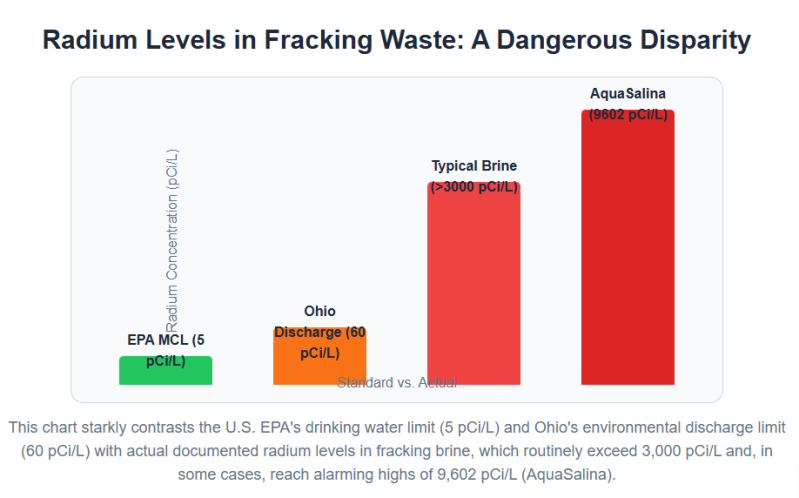 The chasm between documented radium levels in fracking waste and public safety limits is not merely stark; it's a moral outrage. The U.S. EPA's maximum contaminant level for Radium-226 in drinking water is a paltry 5 picocuries per liter (pCi/L). Ohio's own environmental discharge limits are 60 pCi/L. For landfill disposal, the limit is a microscopic 0.005 pCi/L. Yet, actual brine samples trucked across Ohio routinely register above 3,000 pCi/L, with some hitting a horrifying 7,300 pCi/L. AquaSalina, a commercially peddled road de-icer, was found by ODNR in 2017 to contain radium levels 300 times higher than federal drinking water standards, with one sample screaming at 9,602 pCi/L. An ODNR 2018 report confirmed Marcellus brine averaging 2,316 pCi/L. Even soil near the now-shuttered Austin Master Services waste facility in eastern Ohio showed radium levels significantly above national background.