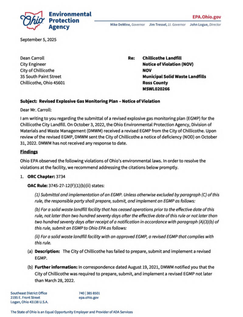 The Ohio EPA issued a Notice of Violation (NOV) to the City of Chillicothe, citing failures to comply with state laws governing closed landfills. At the center of the issue: the city’s repeated failure to submit and implement a revised Explosive Gas Monitoring Plan (EGMP)—a requirement meant to protect nearby communities from dangerous gas migration and other hazards linked to buried industrial waste.
