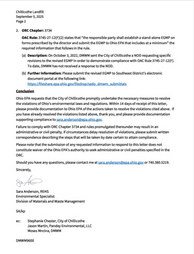 The violation notice was also copied to Stephanie Chester, City of Chillicothe, and Jason Martin of Pandey Environmental, LLC—the city’s environmental consultant. Yet, despite repeated warnings, there’s been no documented response.
