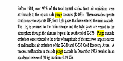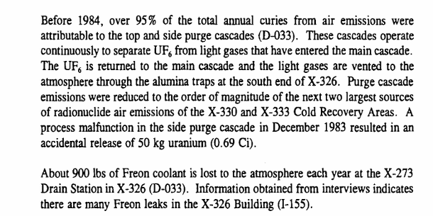 In December 1983, a specific "process malfunction" in the X-326 side purge cascade resulted in an accidental release of a substantial 50 kg of uranium. This single event, occurring three years before the first media report on venting from the facility.