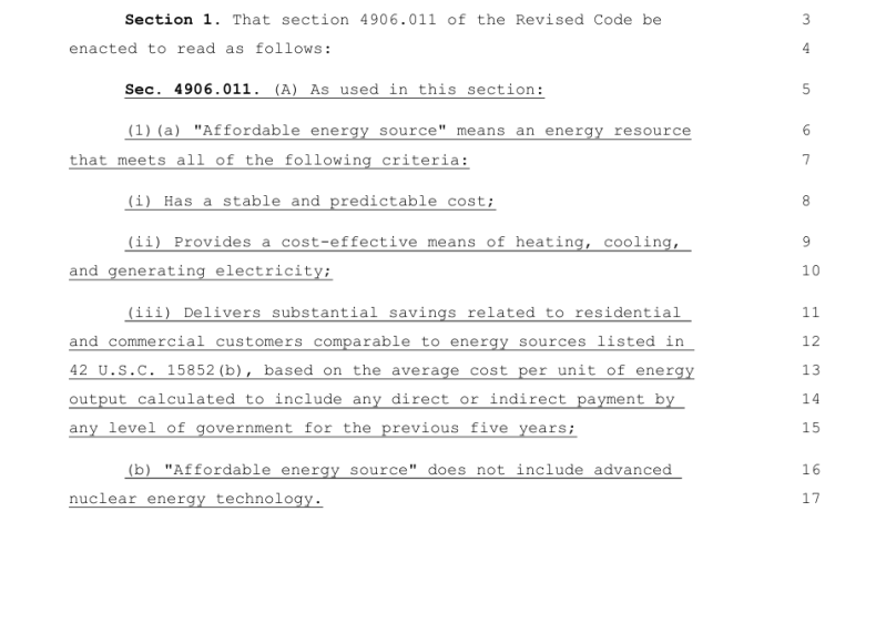 The legislation states it is the public policy of Ohio to ensure “affordable, reliable, and clean energy security” across the state while giving preference to energy sources that meet those standards.